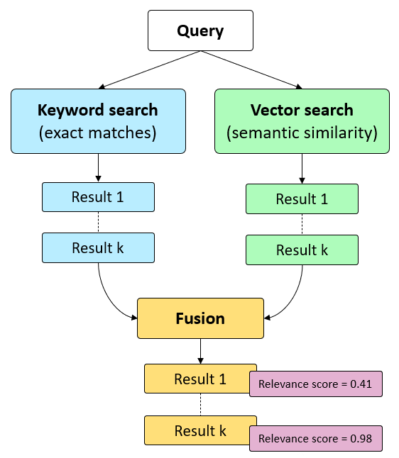 Hybrid search is een geavanceerde zoektechniek die de sterktes van vector search combineert met die van een klassieke keyword search. Keyword search (lexicaal zoeken) maakt gebruik van exacte overeenkomsten van trefwoorden in de tekst. Het is snel en eenvoudig, maar mist soms de contextuele nuances. Bij vector search (semantisch zoeken) wordt de betekenis in rekening gebracht. In de praktijk blijkt dat een combinatie van beide methodes betere resultaten oplevert dan elke methode afzonderlijk.