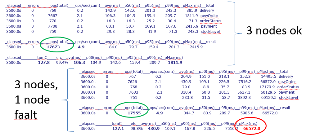 Voor de drie geteste databases bekwamen we gelijkaardige resultaten. Alle drie bleven ze functioneel bij het falen van één van de drie nodes. Bij de laatste, NuoDB, vroeg dit echter extra configuratiewerk. Voor CockroachDB en TiDB was dit out-of-the-box ondersteund. Daarnaast werd de performantie weinig beïnvloed door het node-falen; er waren nauwelijks minder transacties in de testperiode (enkel voor NuoDB was het verschil iets groter). Wat wel opviel, was dat enkele transacties een stuk langer duurden. We vermoeden dat deze transacties werden gedaan op het moment van het node-falen, waardoor ze werden benadeeld. Al bij al voldeden de drie geteste producten echter wel goed aan onze verwachtingen van beschikbaarheid. Hieronder een voorbeeld van de cijfers van de test van CockroachDB.