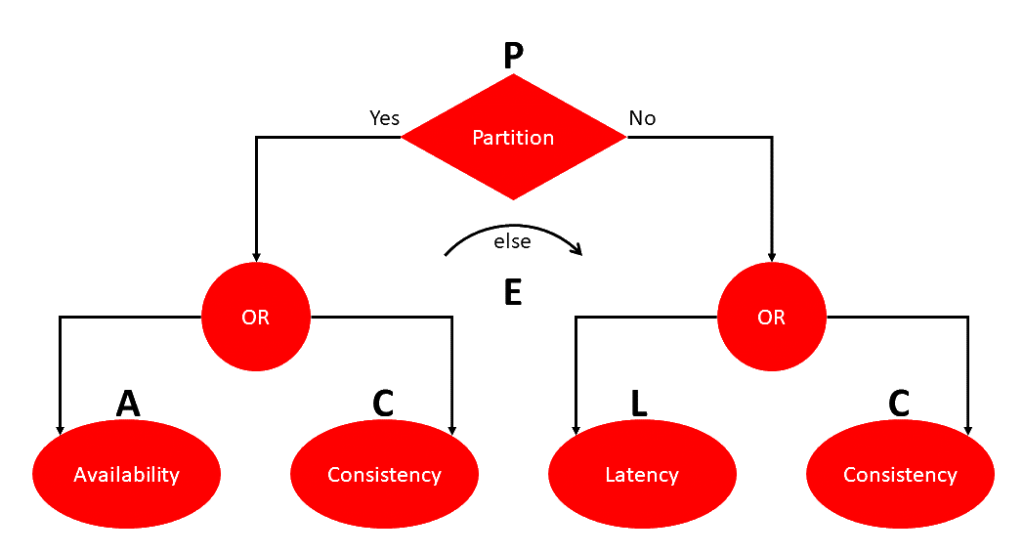 De afkorting PACELC kan men dan via het volgende zinnetje opbouwen: Bij netwerkpartitie (P), moet men kiezen tussen beschikbaarheid (Availability) en Consistentie (C), en anders (Else), tussen latency (L) en consistentie (C).