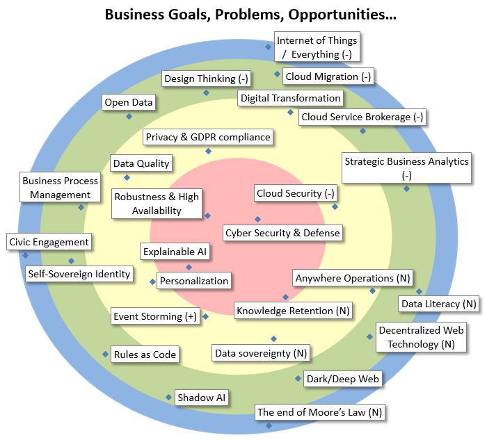 | Internet of Things / Everything | With the Internet of Things (IoT), many (electromechanical) objects, along with a vast amount of sensors and actuators, become connected to the internet and generate an abundance of data, allowing all kinds of new business. |