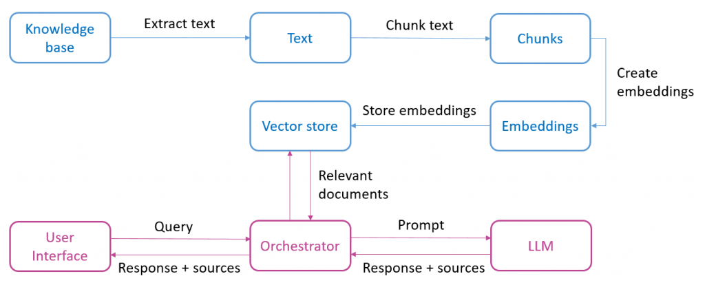 Le schéma ci-dessous présente les éléments qui composent un système de ‘question answering’ basé sur des modèles de langue. La partie supérieure (en bleu) représente toutes les étapes nécessaires à la préparation du contenu :